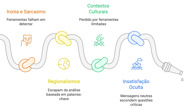 Durante muito tempo, a análise de sentimento foi reduzida a palavras-chave. Esse modelo já não funciona. Ironia, sarcasmo, regionalismos e contextos culturais escapam de ferramentas limitadas. O que importa não é classificar um comentário como positivo ou negativo, mas entender o impacto real daquela percepção. Uma mensagem aparentemente neutra pode esconder uma insatisfação crítica que coloca em risco uma fatia relevante do faturamento.